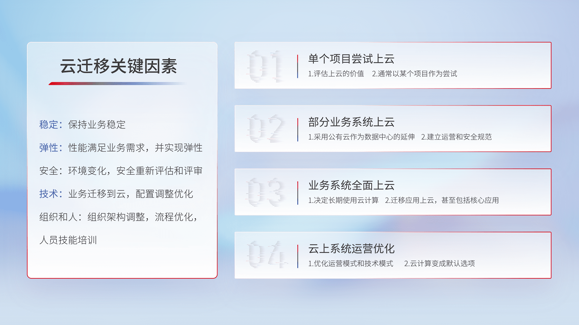 结合实际业务,,,,从规划设计、、、云平台选型、、、、云原生改造、、数据迁移、、、集成交付,,,,迁移全过程为客户识别最佳上云路径,,,,做好风险识别管理,,设计网络架构、、身份权限、、、安全审计合规、、操作审计、、、、日志审计、、、监控告警策略、、多站点容灾设计等,,,对云上基础设施进行整体规划,,,提升IT治理水平,,以满足弹性、、、高可用、、、高性能的需求。。。