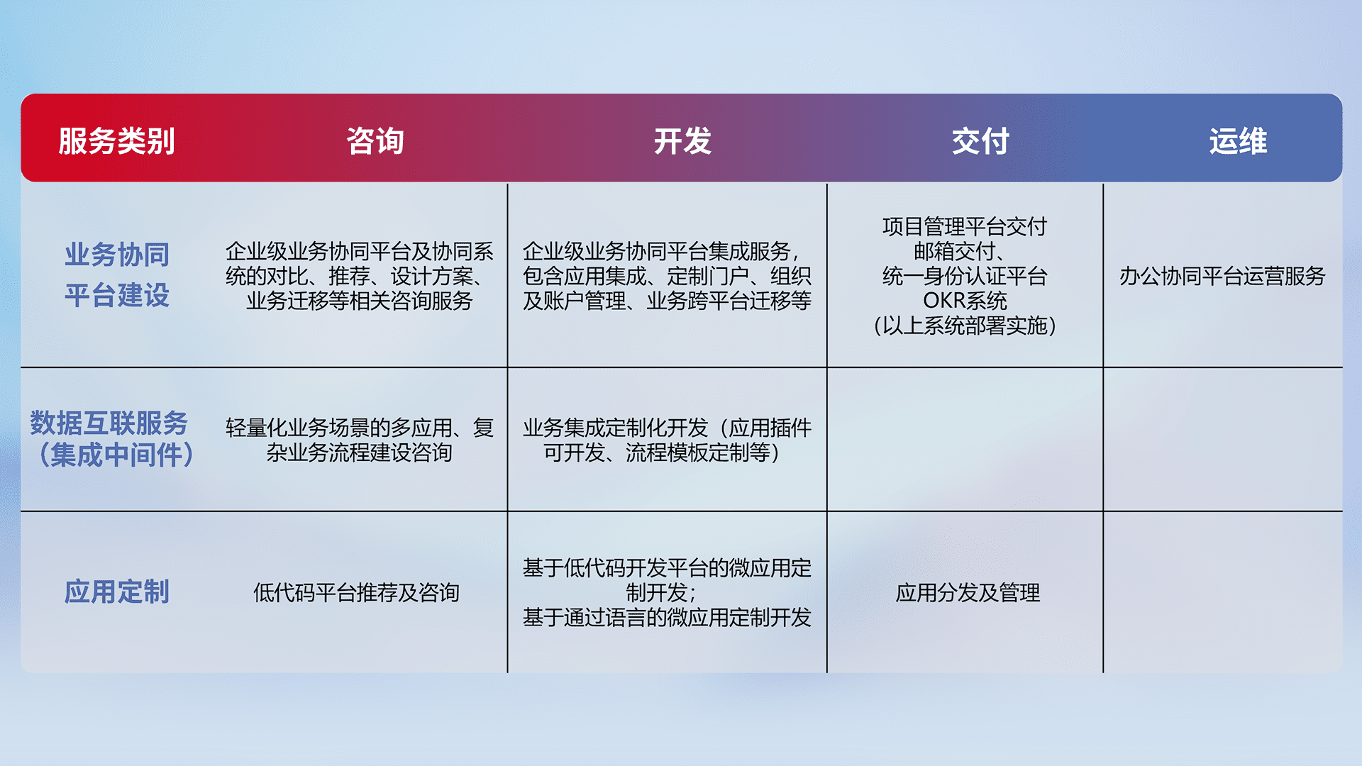 针对钉钉、、、、企微、、IDaas等平台级产品提供产品的规划、、方案、、、交付、、定制化开发等服务,,实现如统一协同办公、、、智能客户服务、、、混合会议管理、、、、智能数据查询、、、等业务场景,,实现数字化转型。。。。